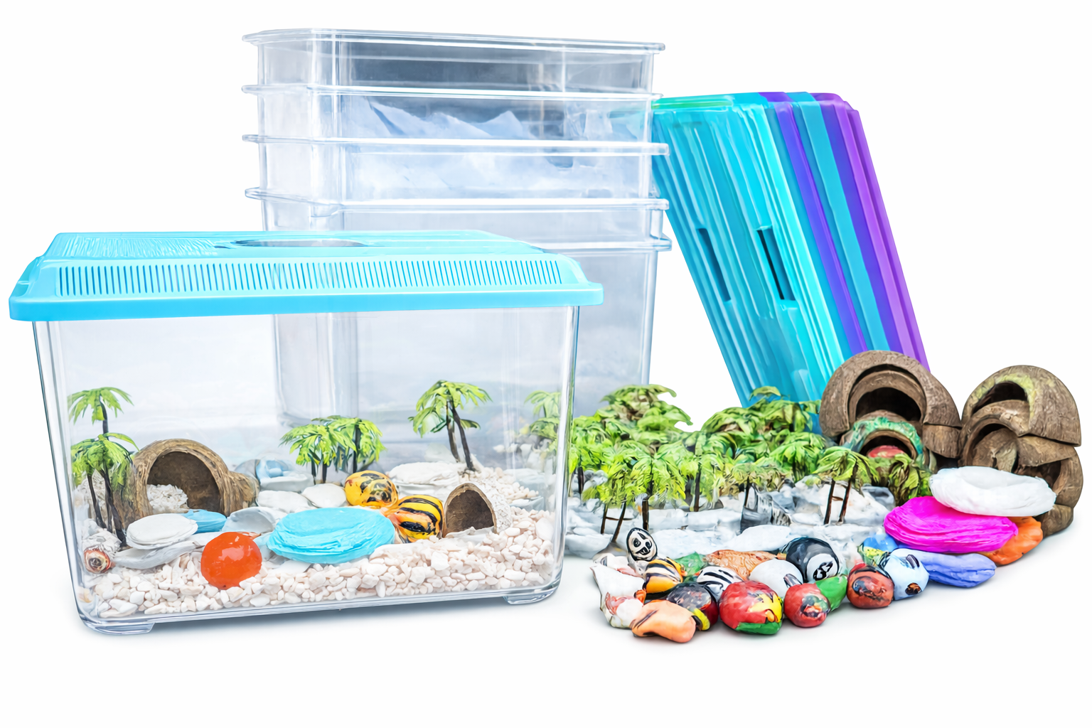3 medium Palm tree dish, 2 coco hut, 1 neon pool, 3 medium painted shells and 1 large plastic cage