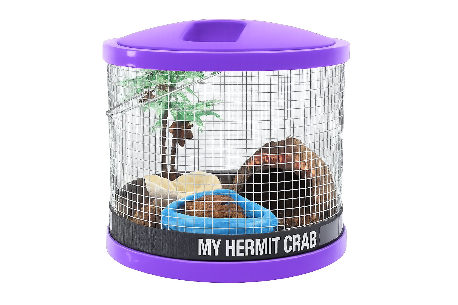 Includes: medium wire cage, palm tree dish, coco fiber, neon tub, natural sponge, two fancy shells, coco hut, 4 oz food. (Cage size 7.5Â in dia. x 7 in high)